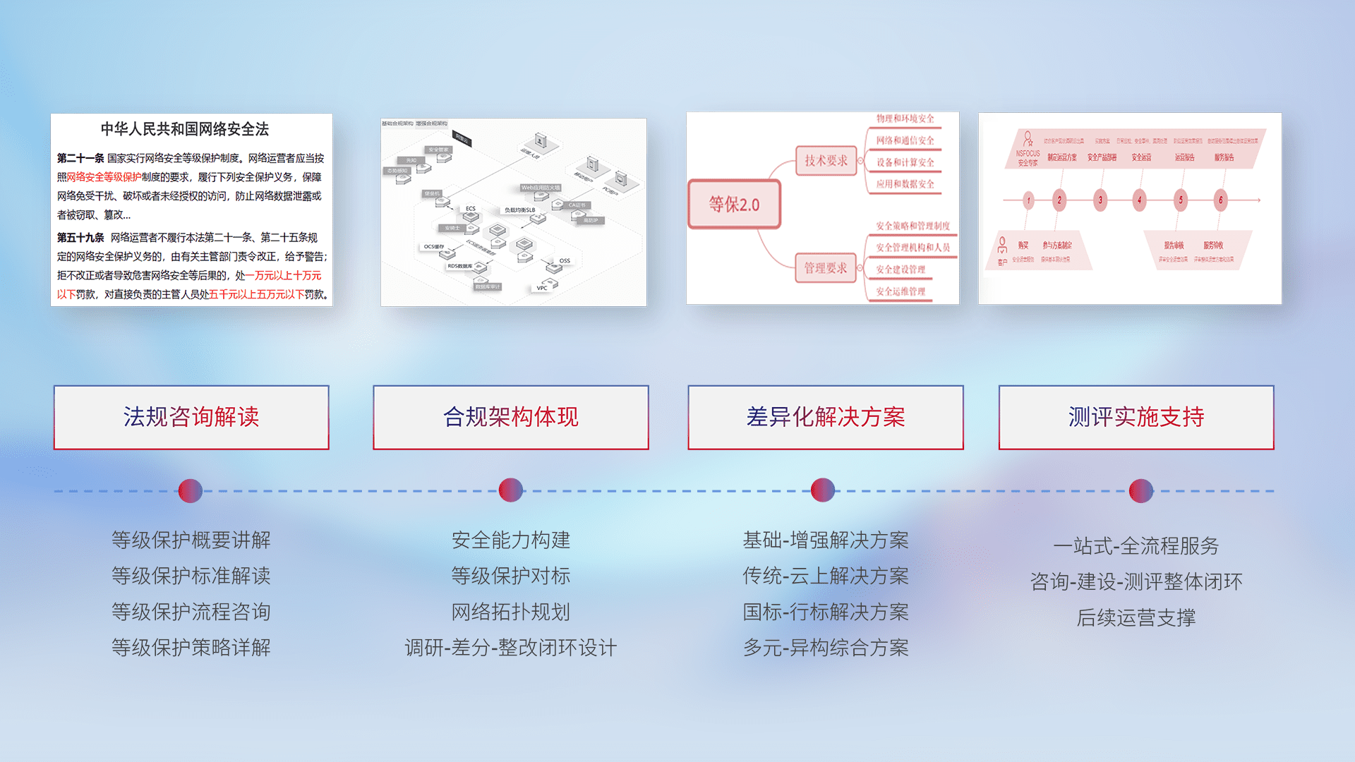 通过专业的法律咨询解读、、、、合规架构体现、、差异化解决方案、、、测试实施支持等服务,,为客户量身打造等保合规体系。。。